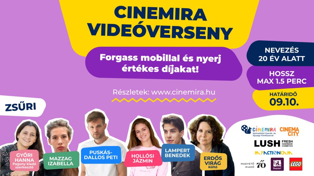 Ha még nem múltál el húsz éves, van egy mobilod, egy jó ötleted, és érdekel a filmkészítés, akkor a Cinemira Videóverseny 2025 neked szól! A pályázat célja, hogy a fiatal alkotók megmutathassák kreativitásukat rövid, maximum másfél perces filmekben. A legjobb videók nemcsak értékes filmes nyereményekért (kamerák és drónok ingyenes bérlése, Cinema City VIP belépő, páros mozijegy, koncertjegyek, legújabb menő LEGO készletek, LUSH ajándékcsomagok) versenyeznek, hanem nagyvásznon is bemutatásra kerülnek a Cinemira Nemzetközi Gyerek- és Ifjúsági Filmfesztiválon, október 19-én.